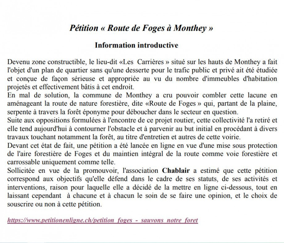 Information - Pétition soutenue par Chablair