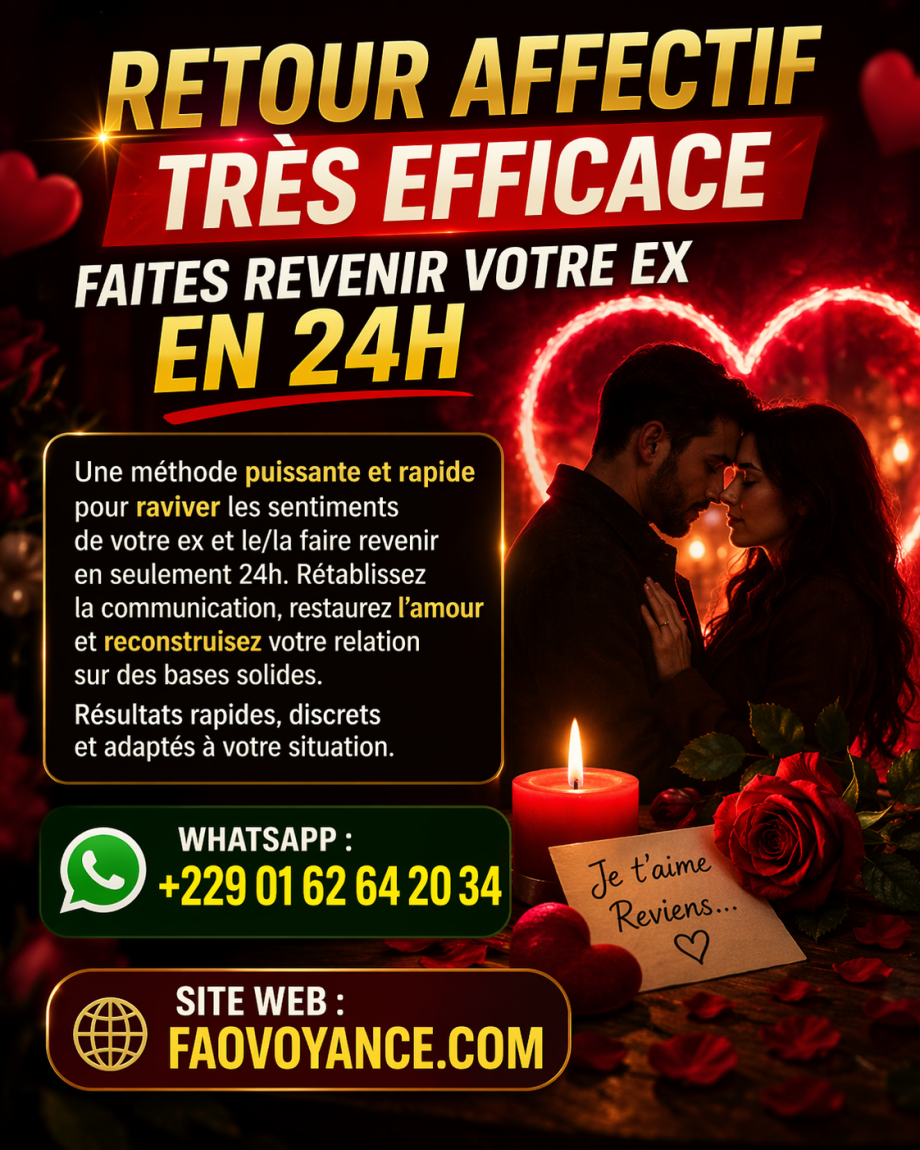 Je suis Maître Fao, médium et praticien spirituel expérimenté. Grâce à mes rituels puissants d’envoûtement d’amour et de retour affectif, j’aide déjà plusieurs personnes à retrouver leur âme sœur et à sauver leur couple.